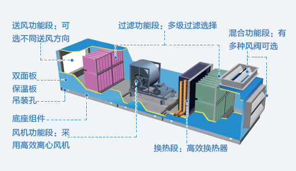 3. 功能段豐富,粗效、中效、亞高效和高效多種不同過濾等級的過濾器及殺菌裝置,可選配紫外光燈、活性炭過濾器、納米光觸媒等綠色功能段,達到空氣處理的潔凈等級要求。